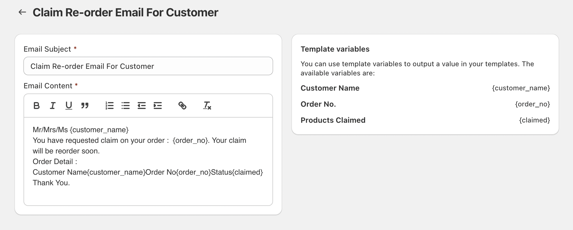 * **Purpose**: Sent to the customer when their claim request for a reorder is approved by the admin.