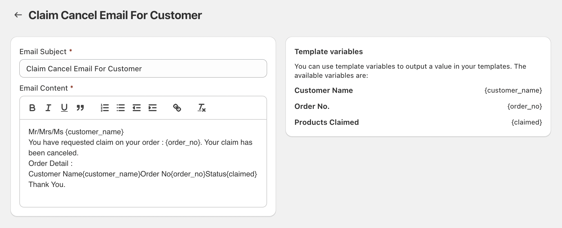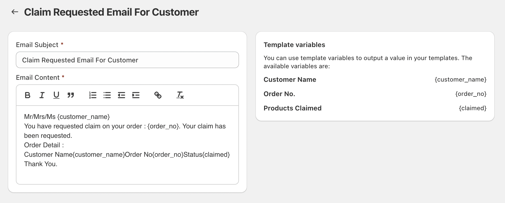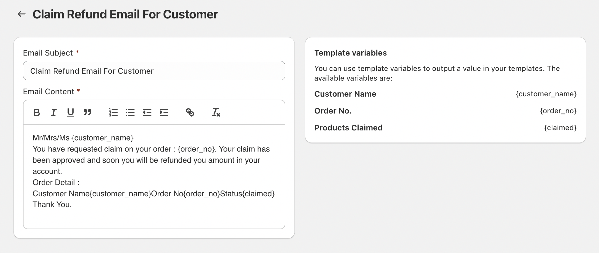 * **Purpose**: Sent to the customer when their claim request for a refund is approved by the admin.