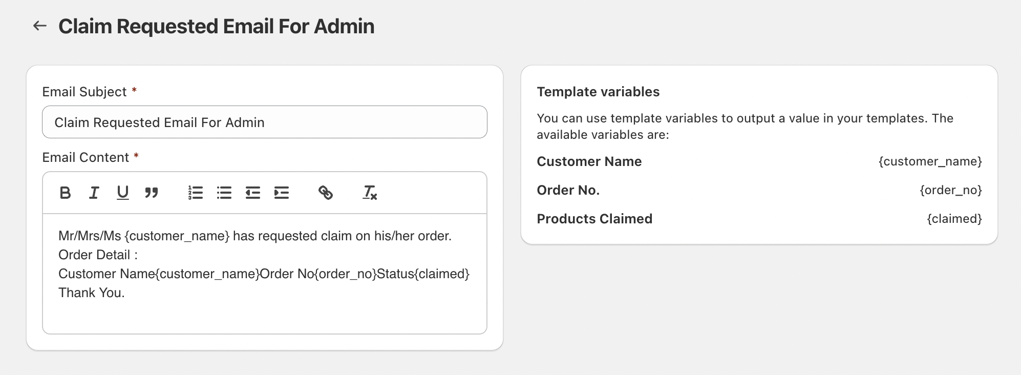 * **Purpose**: Sent to admin when a customer requests a claim on their order.